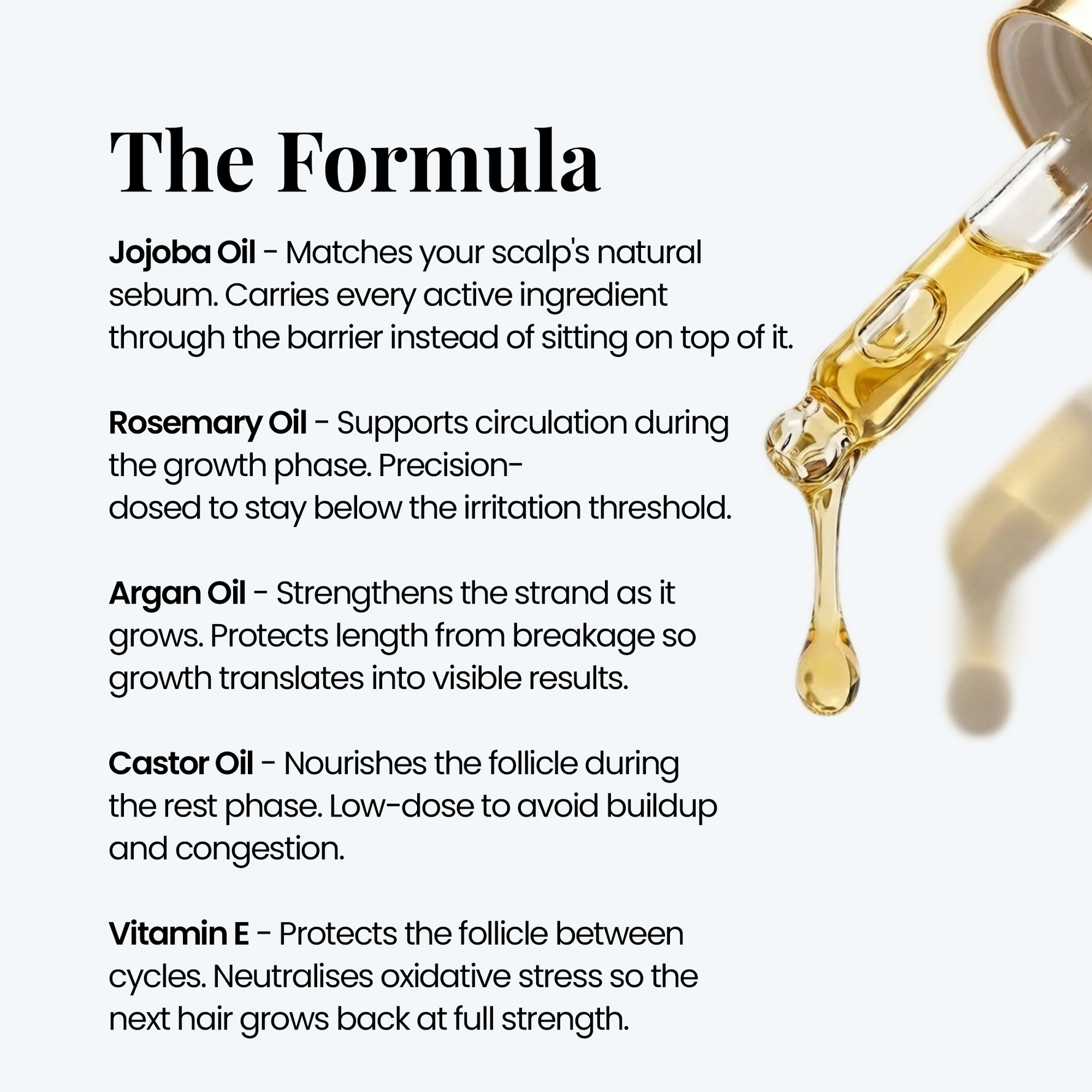 Jojoba-based to match your scalp's own natural oil. So the formula absorbs into the scalp instead of sitting on top of it.